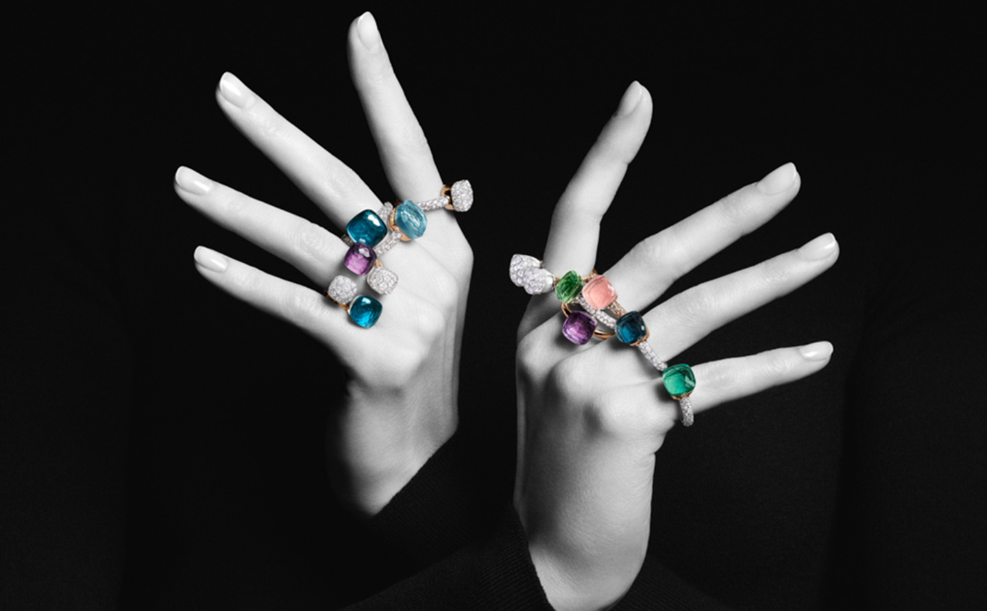 绚丽色彩,尽在掌间。Nudo 系列标志性的彩色宝石挣脱传统束缚,焕发出蓬勃鲜活的生命力,在黑白光影中幻化为纯粹的情感共鸣。每一道不规则的切割面都折射出灵动光线,每一种浓郁的色泽都诉说着独特故事。佩戴它,悦享欢欣,拥抱自由,活出真我姿态。